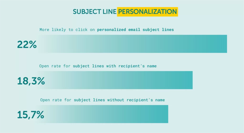 Personalized subject lines get 22% more clicks, and open rates rise from 15.7% to 18.3% by simply adding a customer’s name.