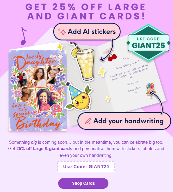 Take a look at this teaser example from personalized greeting card sender, Moonpig. They have teased that “something big is coming soon”, cleverly keeping readers intrigued over what is to come.