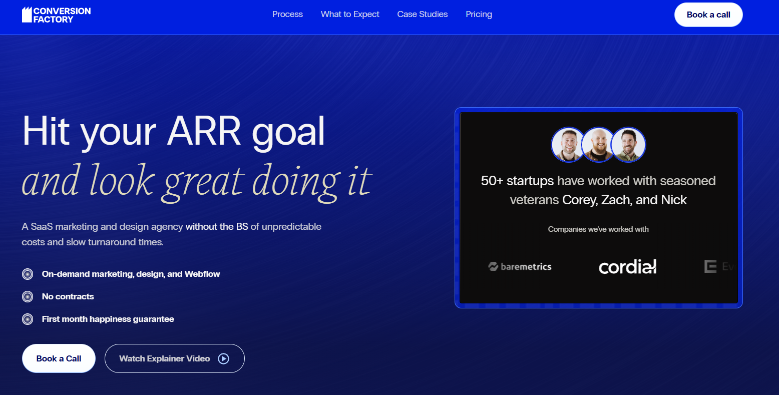 Clients like Workday and Podium have seen 20–50% lifts on funnel pages, and Spiralyze claims an average 38% boost in conversions in the first 90 days. They handle everything in house, design, dev, research, copywriting, and coding, so nothing gets lost in translation. Translation: they move fast and they win often.