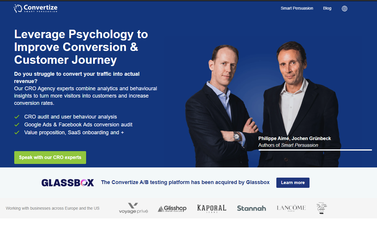 Convertize is Paris based and loves mixing CRO with behavioral science. They’re big on nudges and persuasive design. They even run their own CRO software on the side.
